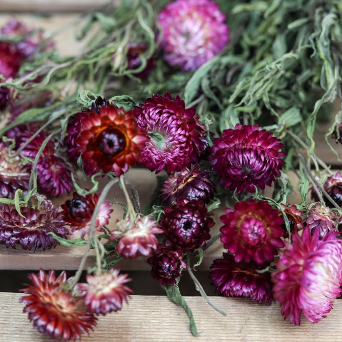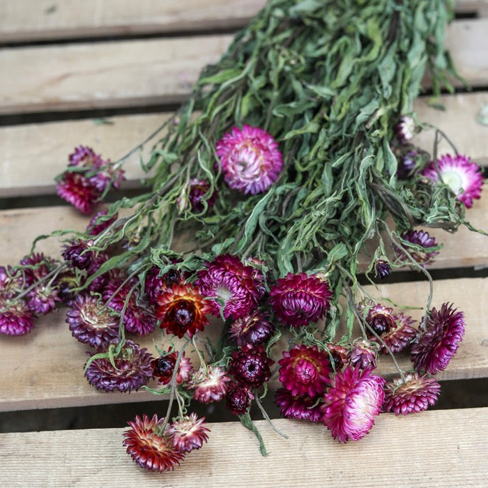 A bunch of dried dark pink Helichrysum, also known as strawflowers. Grown, harvested and dried on our Shropshire flower farm.