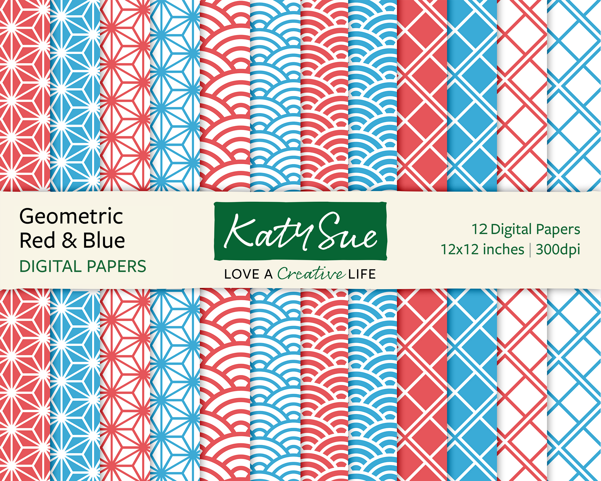 12 bright geometric designs suitable for statement projects, boldly coloured with a retro feel, this collection has three complex designs in a variation of red and blue that will add a pop of colour to any project, a great addition to your digital stash.