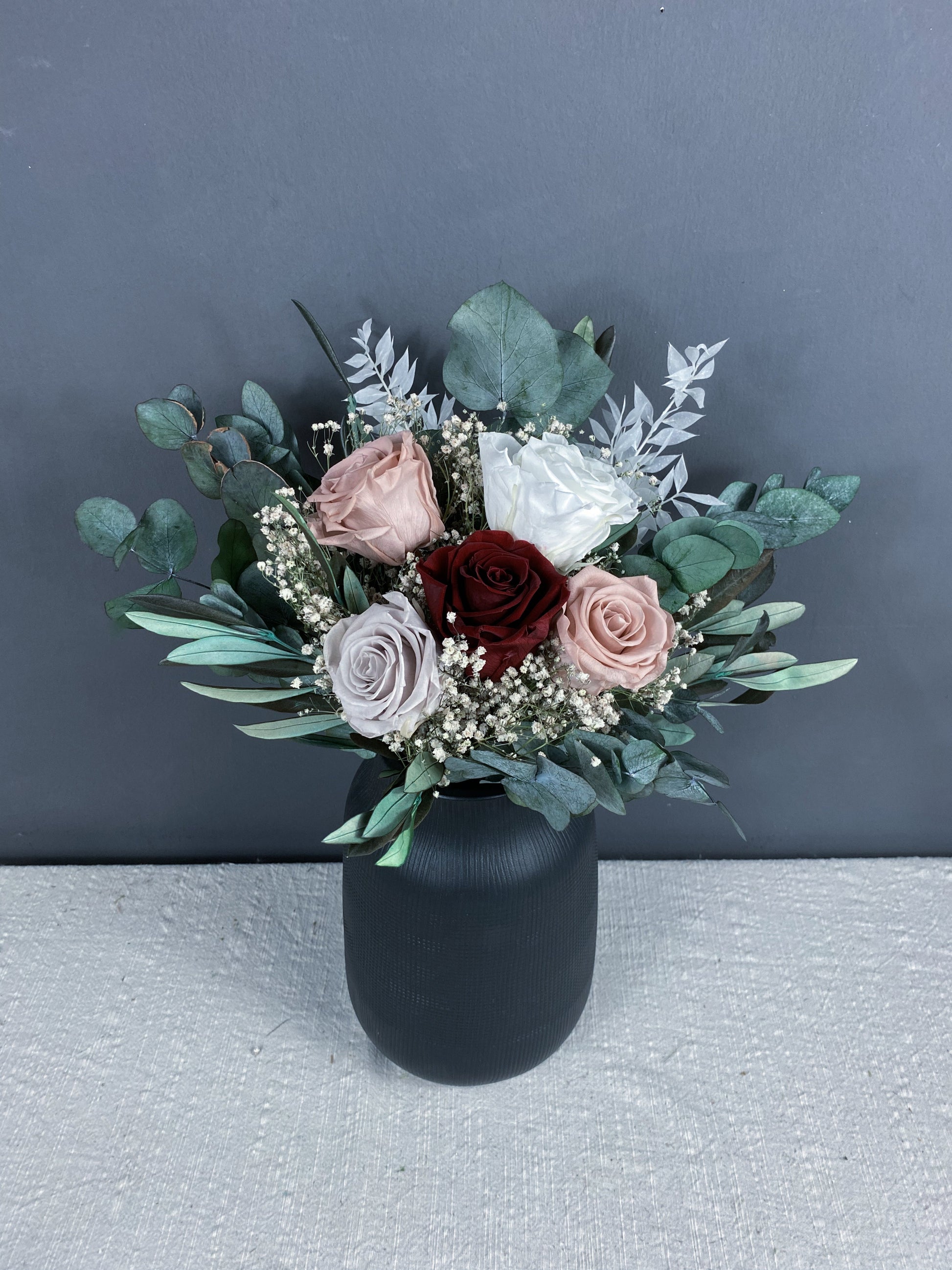 With 5 show-stopping preserved roses that have been preserved to maintain their stunning colours and fresh appearance but last, in a perfect palette of white, pink, red and grey, paired with dried gypsophila, pretty ruscus and preserved eucalyptus and olive.