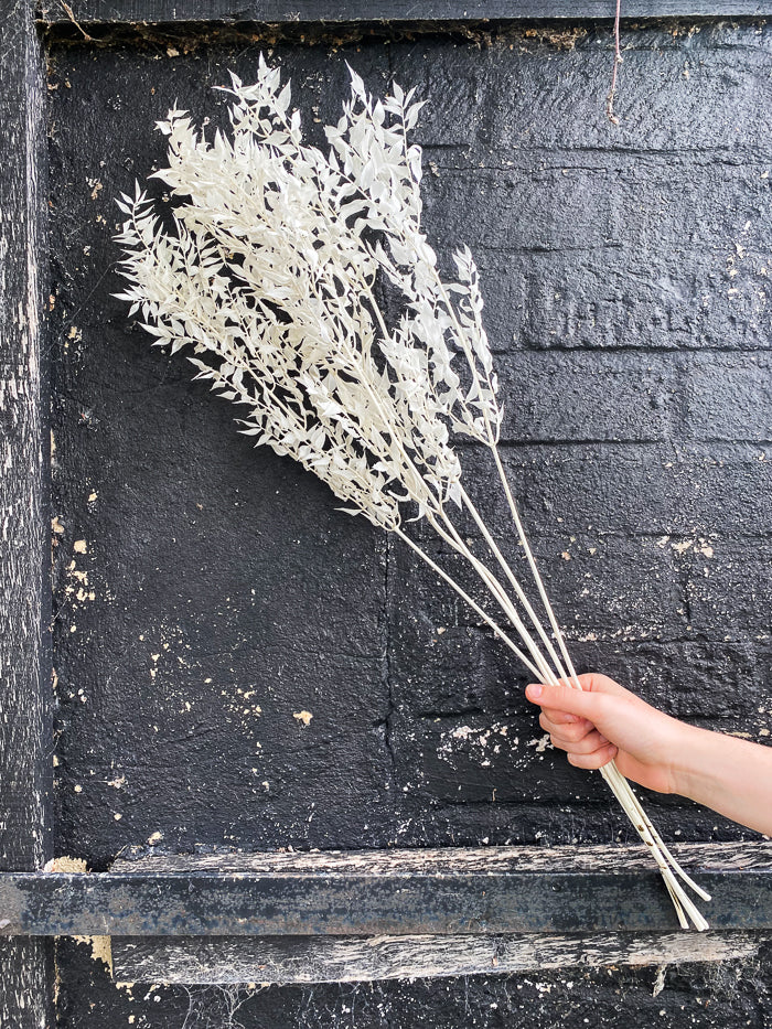 Delicate and pretty, our preserved bleached Ruscus stems look stunning by themselves or as part of your other dried flower arrangements. Measuring approx. 50cm, this dried flower bunch makes a gorgeous statement or can be cut to size down to suit your vase.