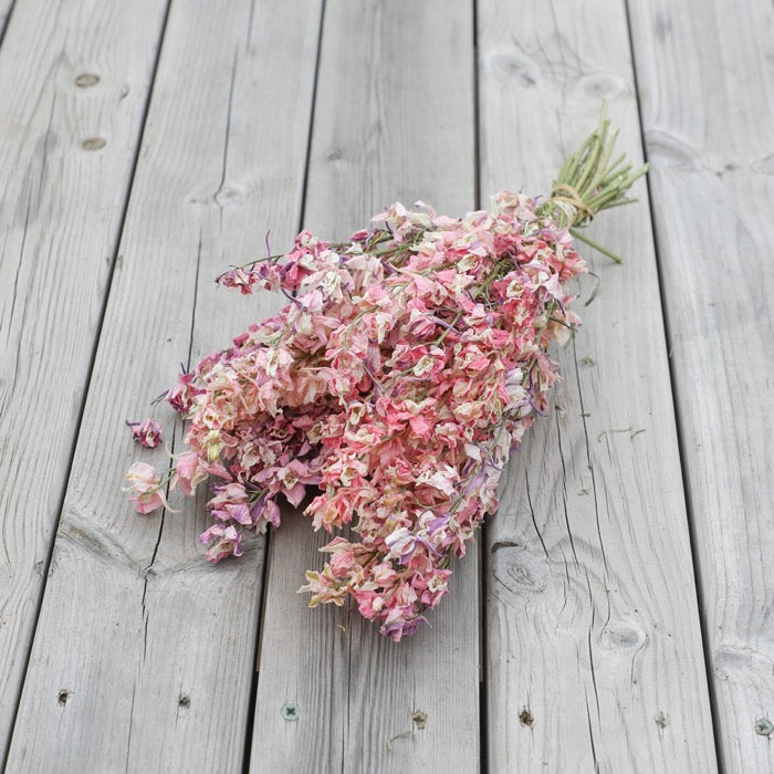 A bunch of our dried mixed pink and lilac delphinium stems all tied together, also known as Larkspur.