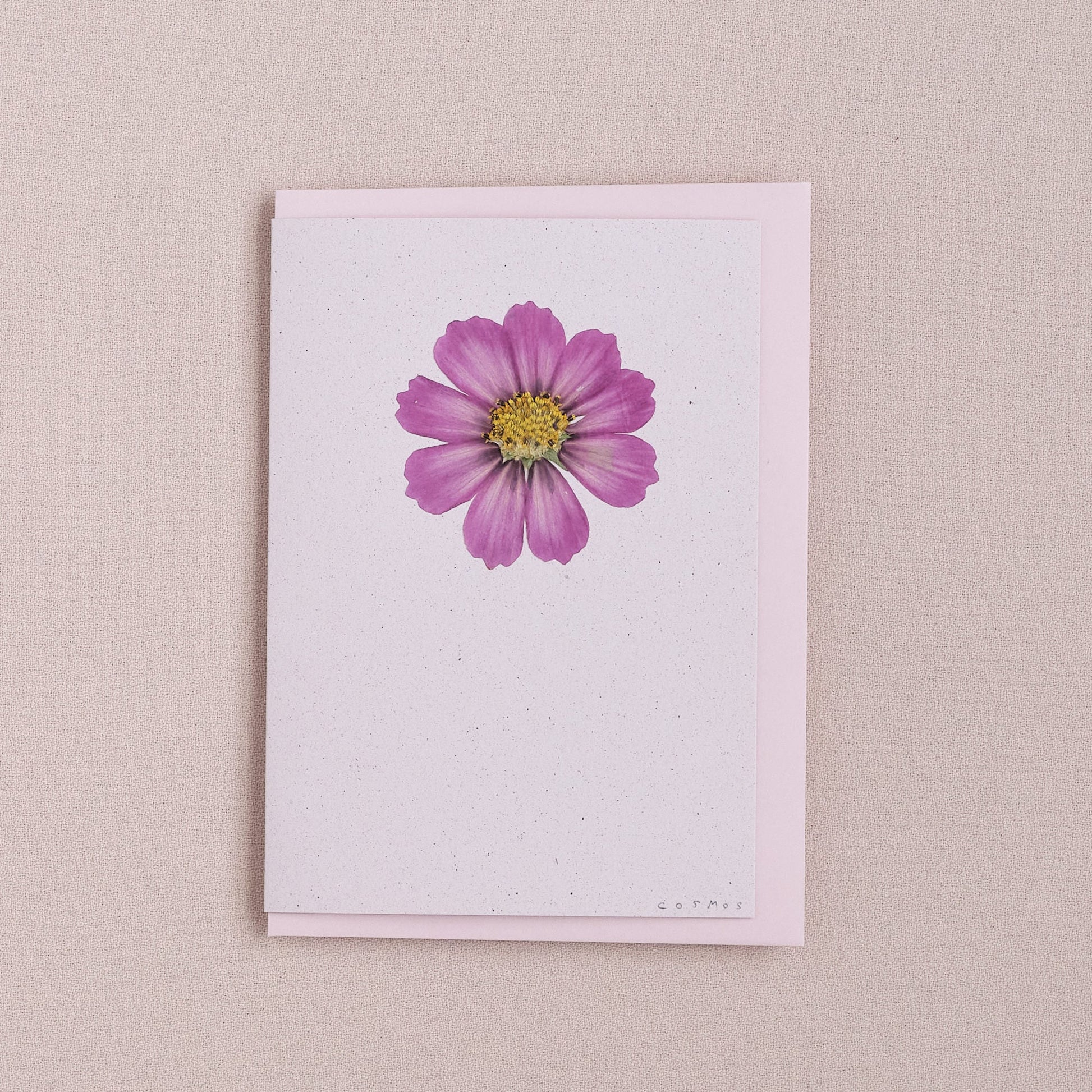 A real pressed flower artwork greetings card, made in London with real Cosmos flowers; the flowers are grown and pressed for us in the Kent countryside.